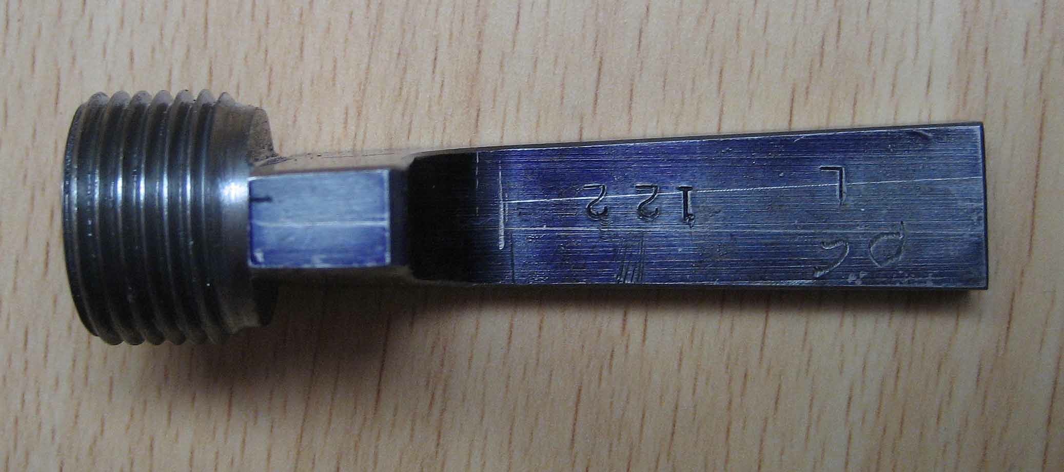 If the face is to be filed, the plug is screwed into the tool and a standard washer is placed over the protruding end of the plug. (The washer will protect the face of the tool, not dull a file, and is easily replaced as necessary.) The plug position is adjusted until just the length to be removed protrudes above the washer. The 8-32 clamp screw is then used to hold the plug in position and the extra plug length is filed off flush and square with the washer / tool face.