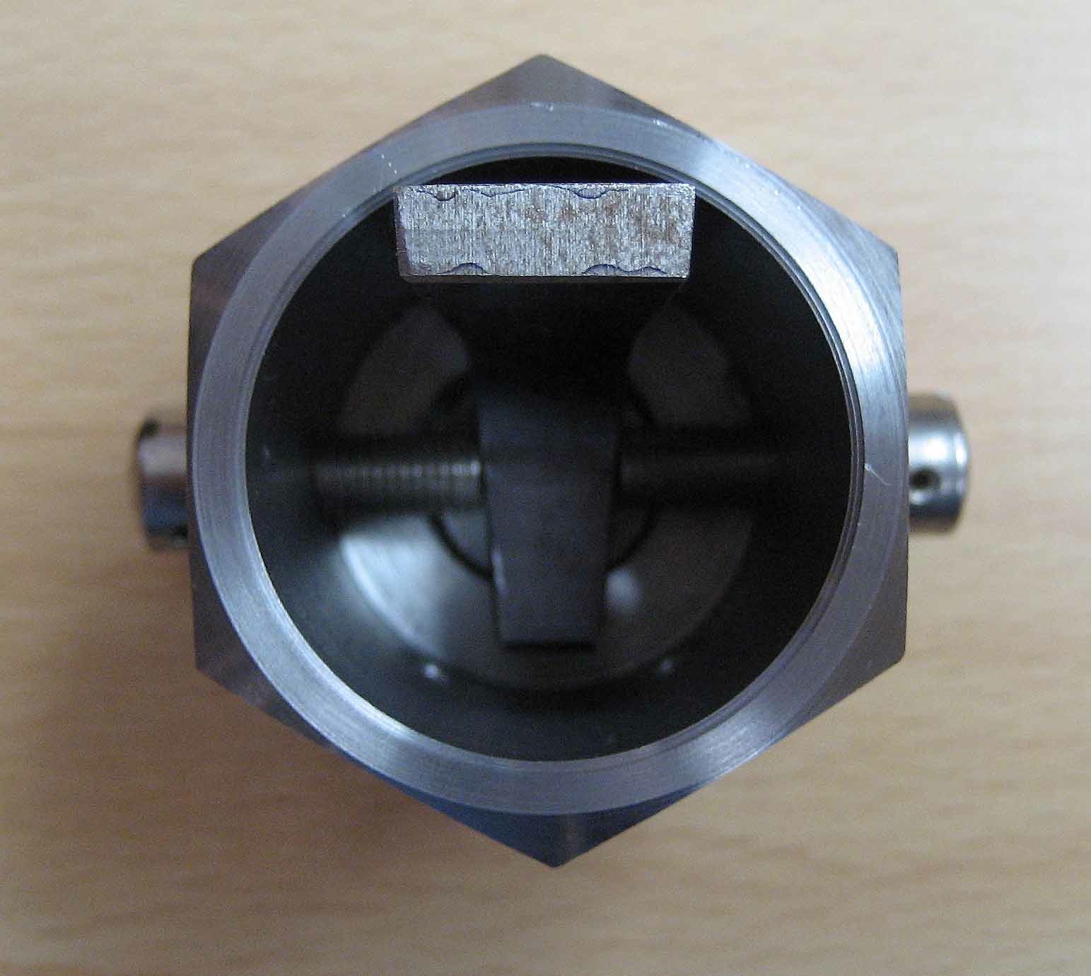 The hexagonal body allows additional clamp screw holes for a little more flexibility in where you can position the plug and makes the tool handy to hold in either the bench vise or a three jaw lathe chuck. For use without a lathe, the added 8-32 screw shown near the edge of the tool allows fine adjustment of the plug position. This screw is fitted with a nylon shoe to prevent damaging the breech plug threads and is used to clamp the plug for facing with a file.