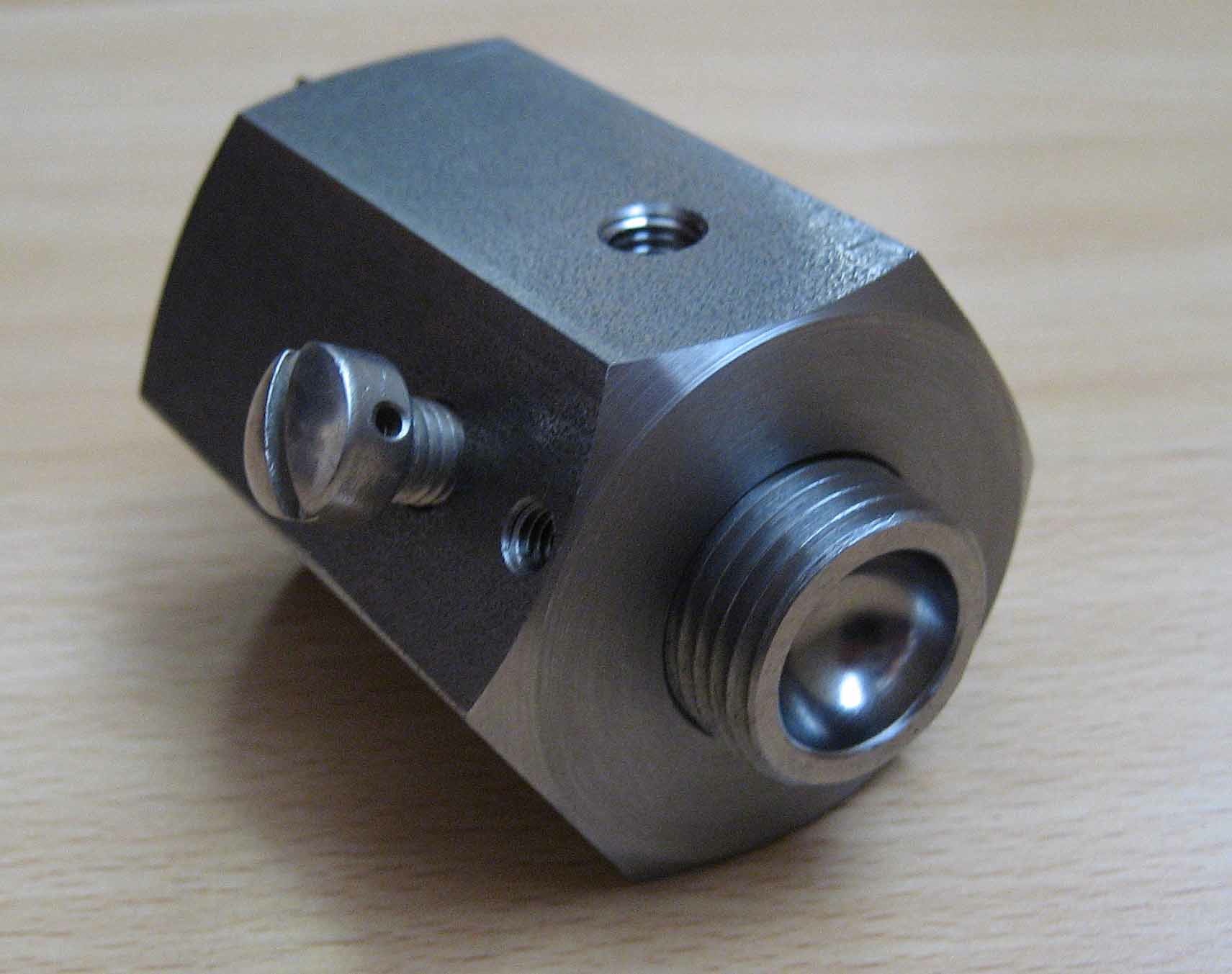 Specifications: Mild steel hexagonal body with two clamp screws and six clamp screw positions. Additional clamp screw for fine adjustment. Please specify breech plug thread diameter and pitch.